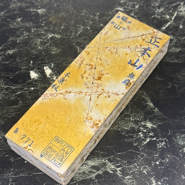 大極上 産地 : 京都市右京区梅ケ畑 山 : 中世中山 種類・層: 超硬偏光種 最大寸法: 70×140×25mm 重さ : 587g かたさ : 4 (※硬さ5段階表記 硬い 5 ⇔ 1 軟らかい) 複数サイトにて出品中の商品のためタイムラグで在庫切になる場合がございます。 大工道具や剃刀、包丁の小刃などに抜群、硬いの好きな方にお勧め 中世中山について 中山でも鎌倉時代ごろから採掘されている場所から採掘したものを「中世中山」として販売しています。 中山、赤ピンは柔らかく包丁などに、赤環巻は硬めで大工道具などに抜群、力を抜いて研ぐと鍛接線くっきり ・京都市右京区梅ヶ畑産の天然砥石について 地殻変動の影響から京都のごく一部の地域でのみ産出する粘板岩の仕上げ砥です。 非常にきめの細かい仕上がりから刃物の仕上げには無くてはならないとされる。 刃先の硬化作用があるとされ、地金とハガネ部の境を際立たせる仕上がりは人造砥石では再現できないといわれています。 京都市右京区梅ケ畑にて約10年 親方のもとで見習い銘砥職人をしております。まだまだ修行中ですがよろしくお願いいたします。 地権者さまの許可を得て山から天然砥石原石を採鉱 選鉱、鍛えを行いチップソーで挽き、面つけを行なっています。 見習い故に拙いものもあるかもしれませんがご容赦ください。