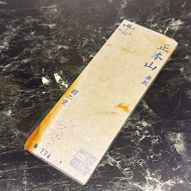 百切級上 産地 : 京都市右京区梅ケ畑 山 : 中世中山 種類・層: 戸前緑赤遷移 最大寸法: 58×160×25mm 重さ : 519g かたさ : 3.5 (※硬さ5段階表記 硬い 5 ⇔ 1 軟らかい) 複数サイトにて出品中の商品のためタイムラグで在庫切になる場合がございます。 障る筋ではないです。 中世中山について 中山でも鎌倉時代ごろから採掘されている場所から採掘したものを「中世中山」として販売しています。 中山、赤ピンは柔らかく包丁などに、赤環巻は硬めで大工道具などに抜群、力を抜いて研ぐと鍛接線くっきり ・京都市右京区梅ヶ畑産の天然砥石について 地殻変動の影響から京都のごく一部の地域でのみ産出する粘板岩の仕上げ砥です。 非常にきめの細かい仕上がりから刃物の仕上げには無くてはならないとされる。 刃先の硬化作用があるとされ、地金とハガネ部の境を際立たせる仕上がりは人造砥石では再現できないといわれています。 京都市右京区梅ケ畑にて約10年 親方のもとで見習い銘砥職人をしております。まだまだ修行中ですがよろしくお願いいたします。 地権者さまの許可を得て山から天然砥石原石を採鉱 選鉱、鍛えを行いチップソーで挽き、面つけを行なっています。 見習い故に拙いものもあるかもしれませんがご容赦ください。