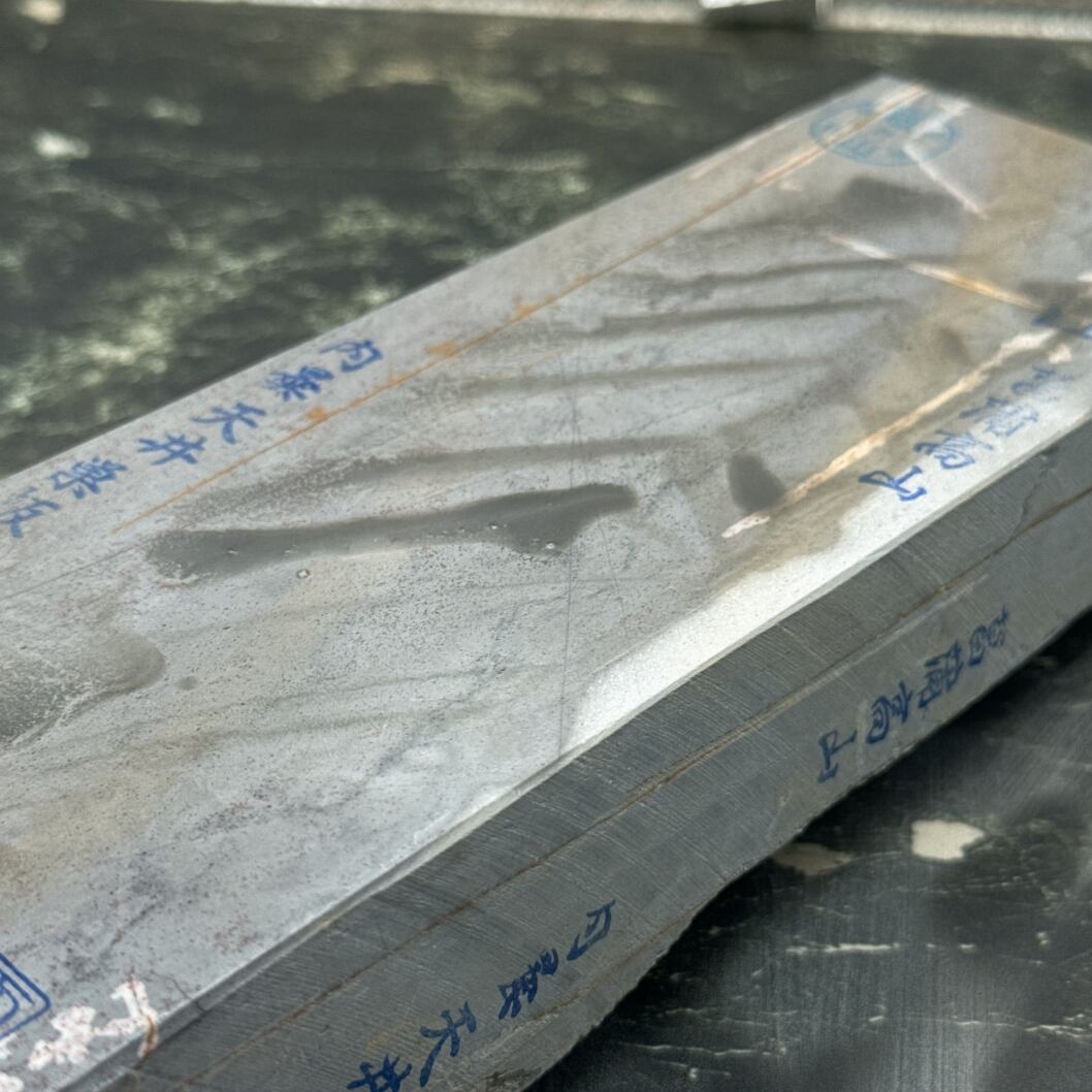 刃先の硬化作用があるとされ、地金とハガネ部の境を際立たせる仕上がりは人造砥石では再現できないといわれています。