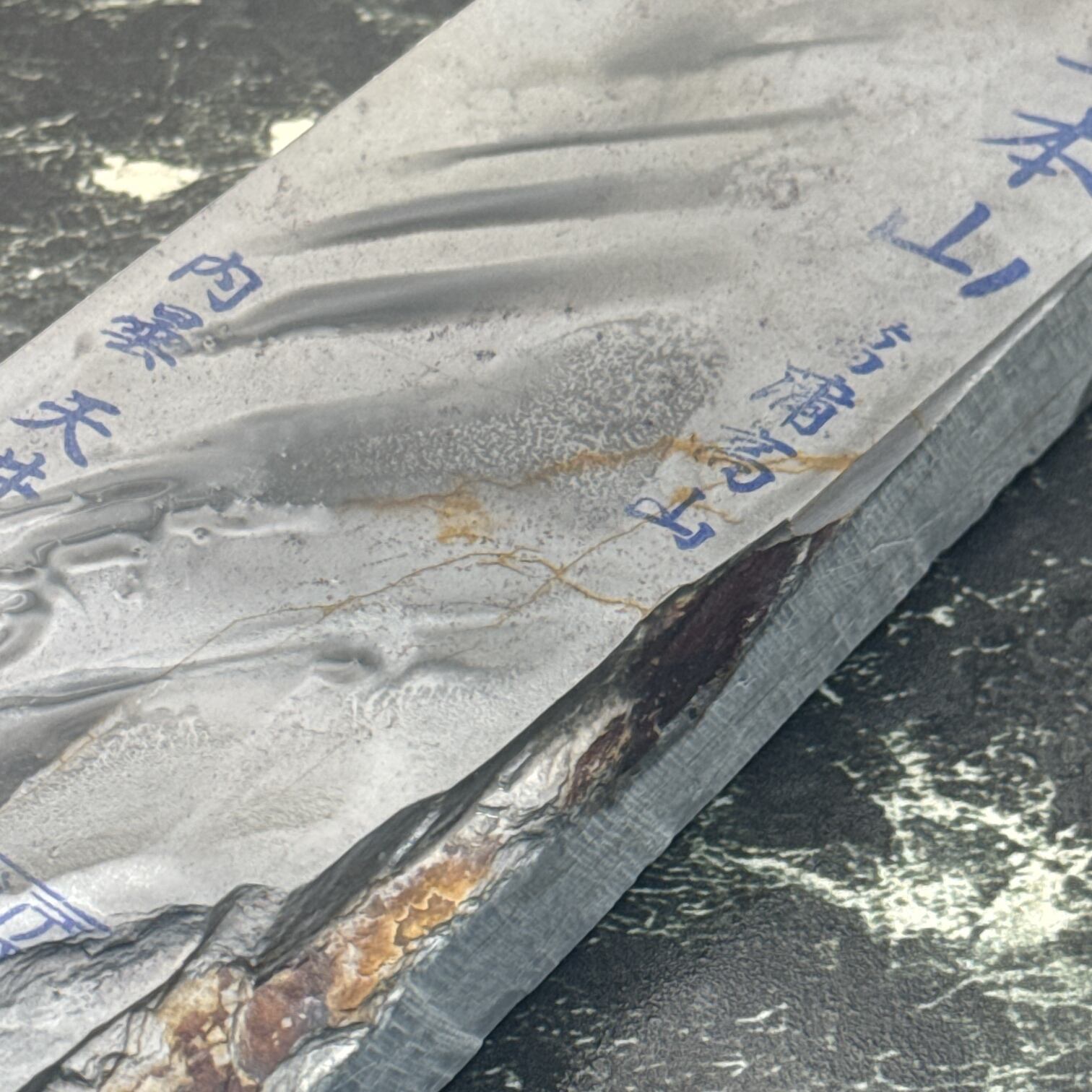 刃先の硬化作用があるとされ、地金とハガネ部の境を際立たせる仕上がりは人造砥石では再現できないといわれています。