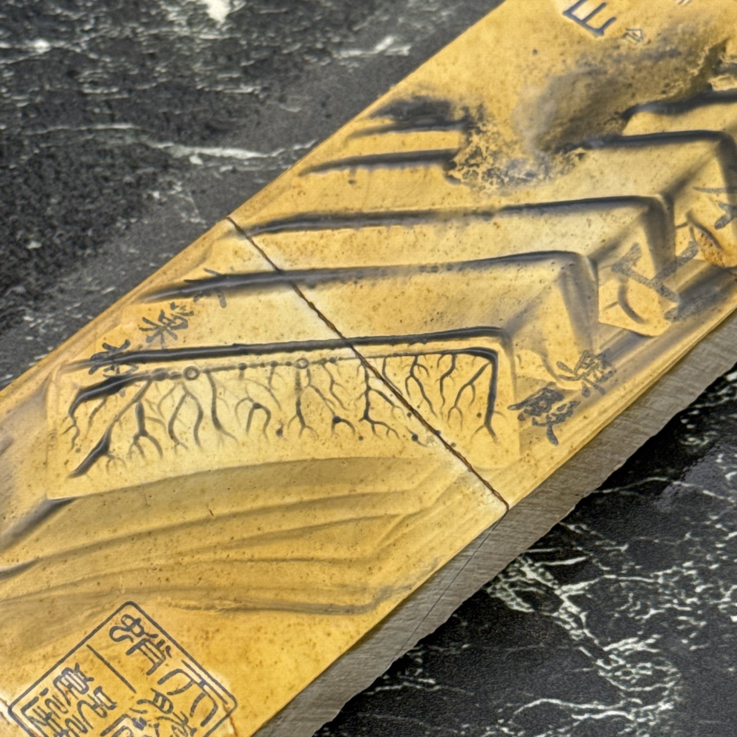 刃先の硬化作用があるとされ、地金とハガネ部の境を際立たせる仕上がりは人造砥石では再現できないといわれています。