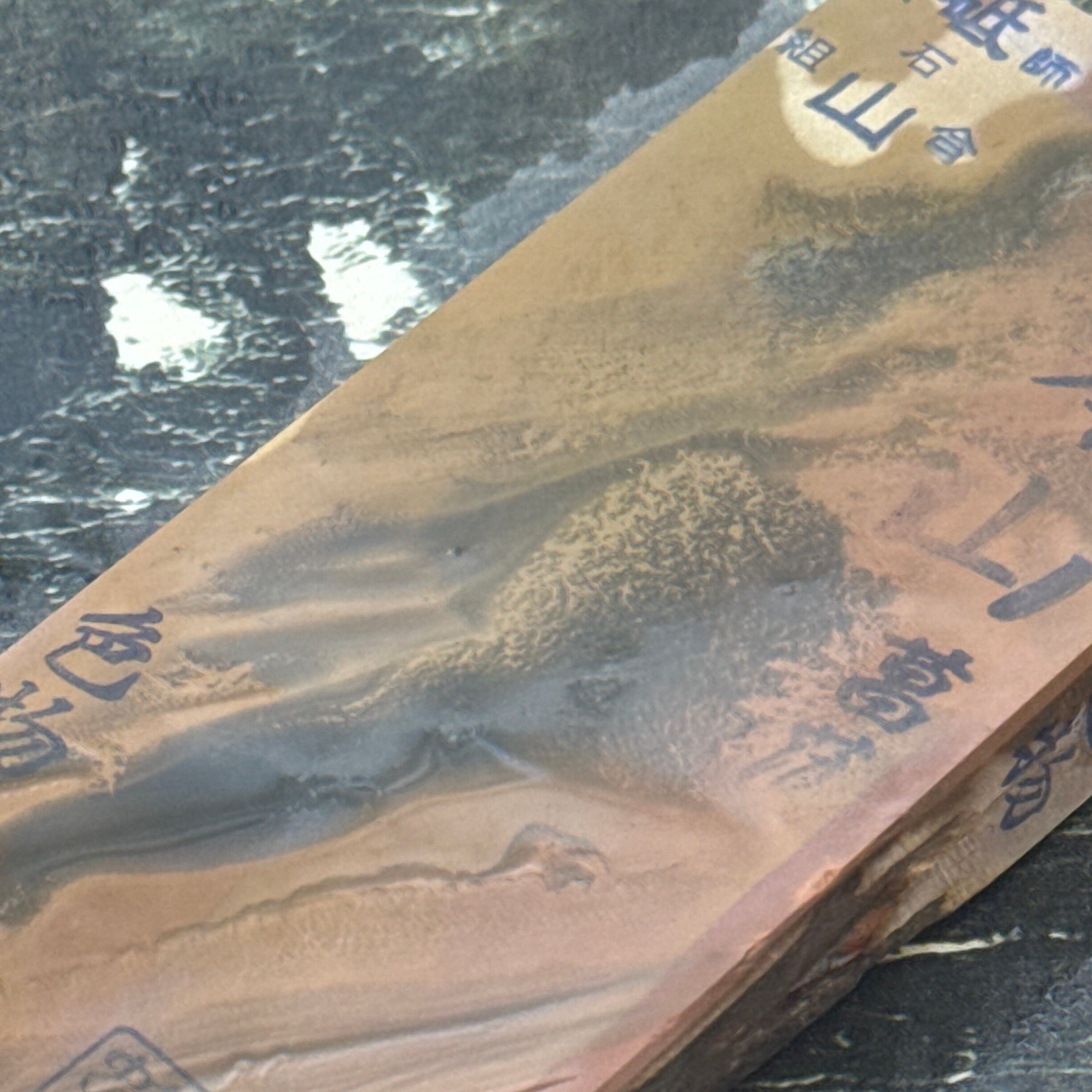 刃先の硬化作用があるとされ、地金とハガネ部の境を際立たせる仕上がりは人造砥石では再現できないといわれています。