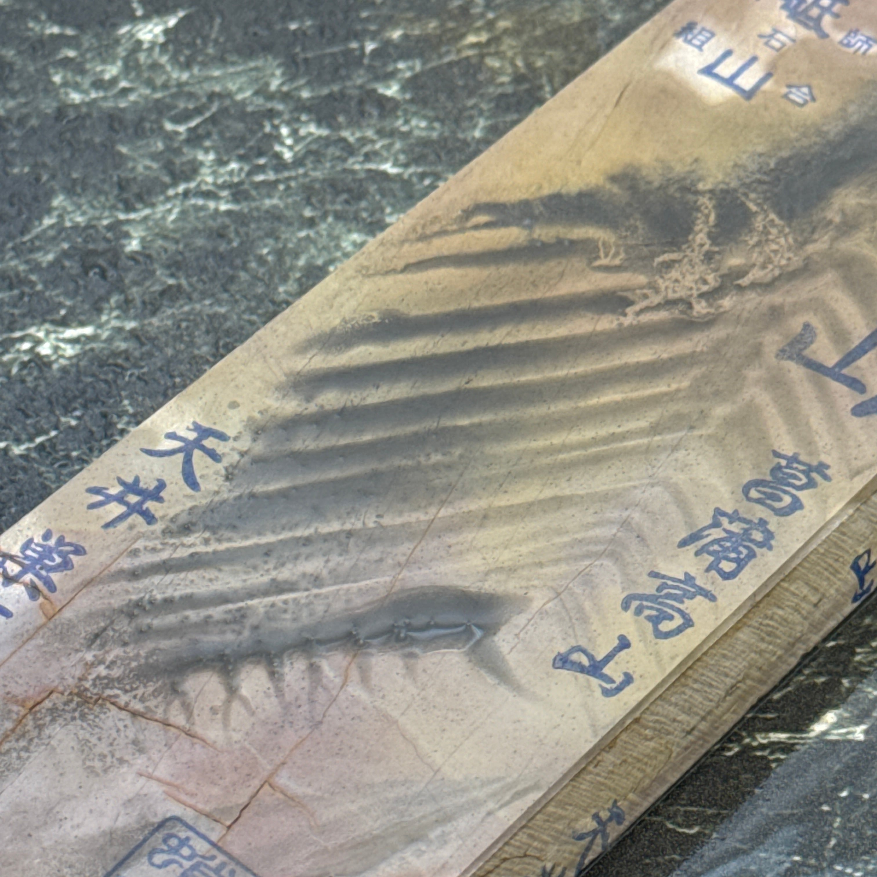 刃先の硬化作用があるとされ、地金とハガネ部の境を際立たせる仕上がりは人造砥石では再現できないといわれています。