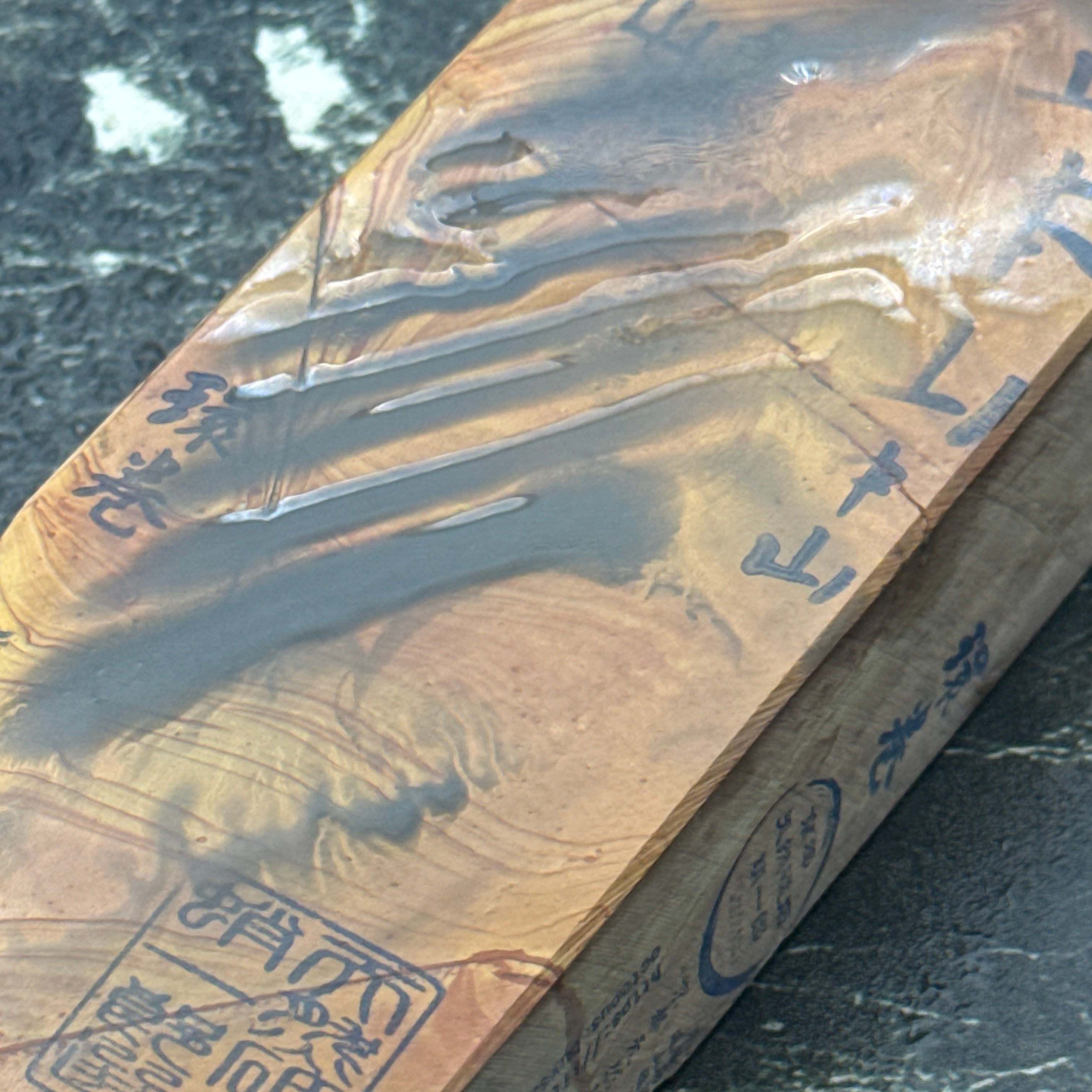 刃先の硬化作用があるとされ、地金とハガネ部の境を際立たせる仕上がりは人造砥石では再現できないといわれています。