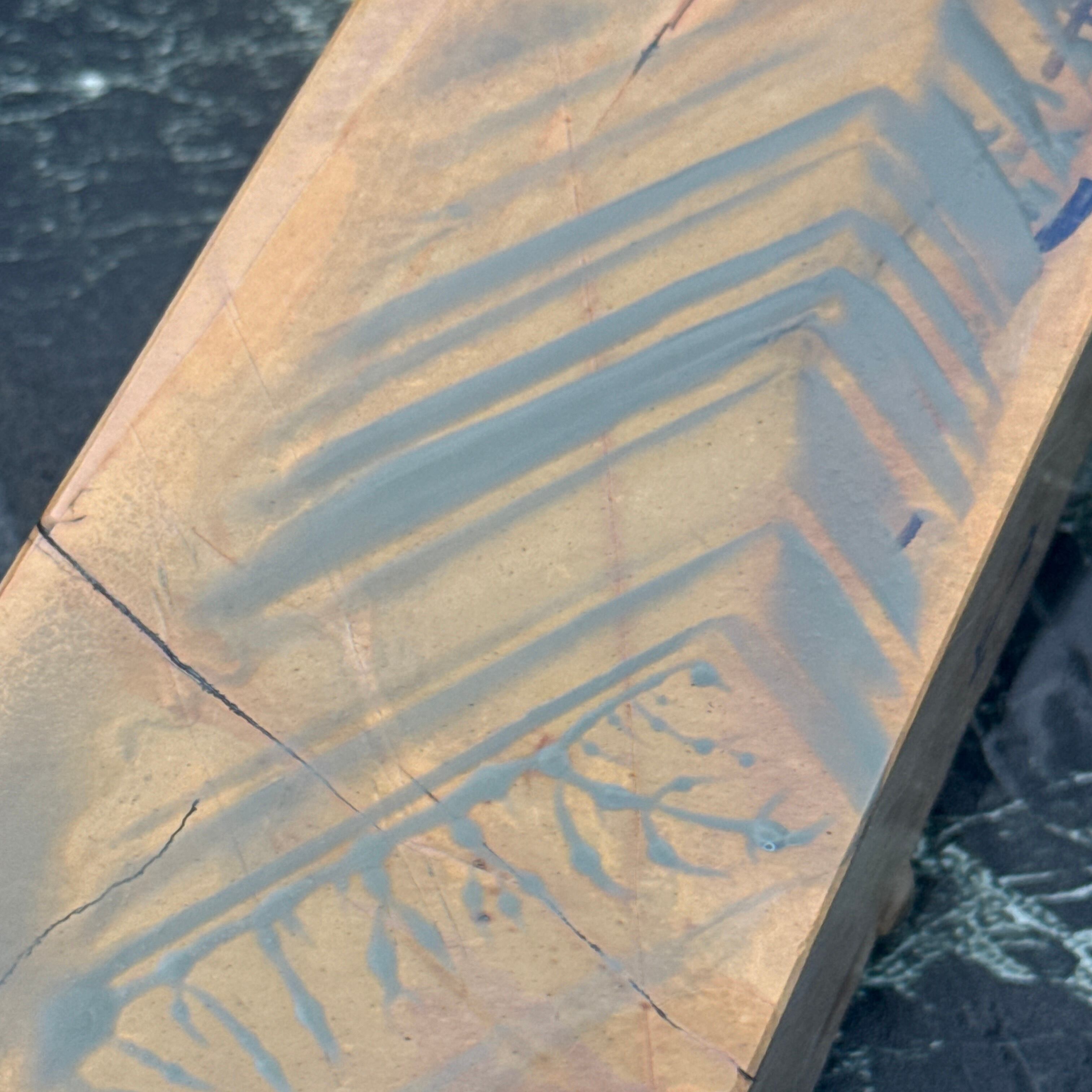 刃先の硬化作用があるとされ、地金とハガネ部の境を際立たせる仕上がりは人造砥石では再現できないといわれています。