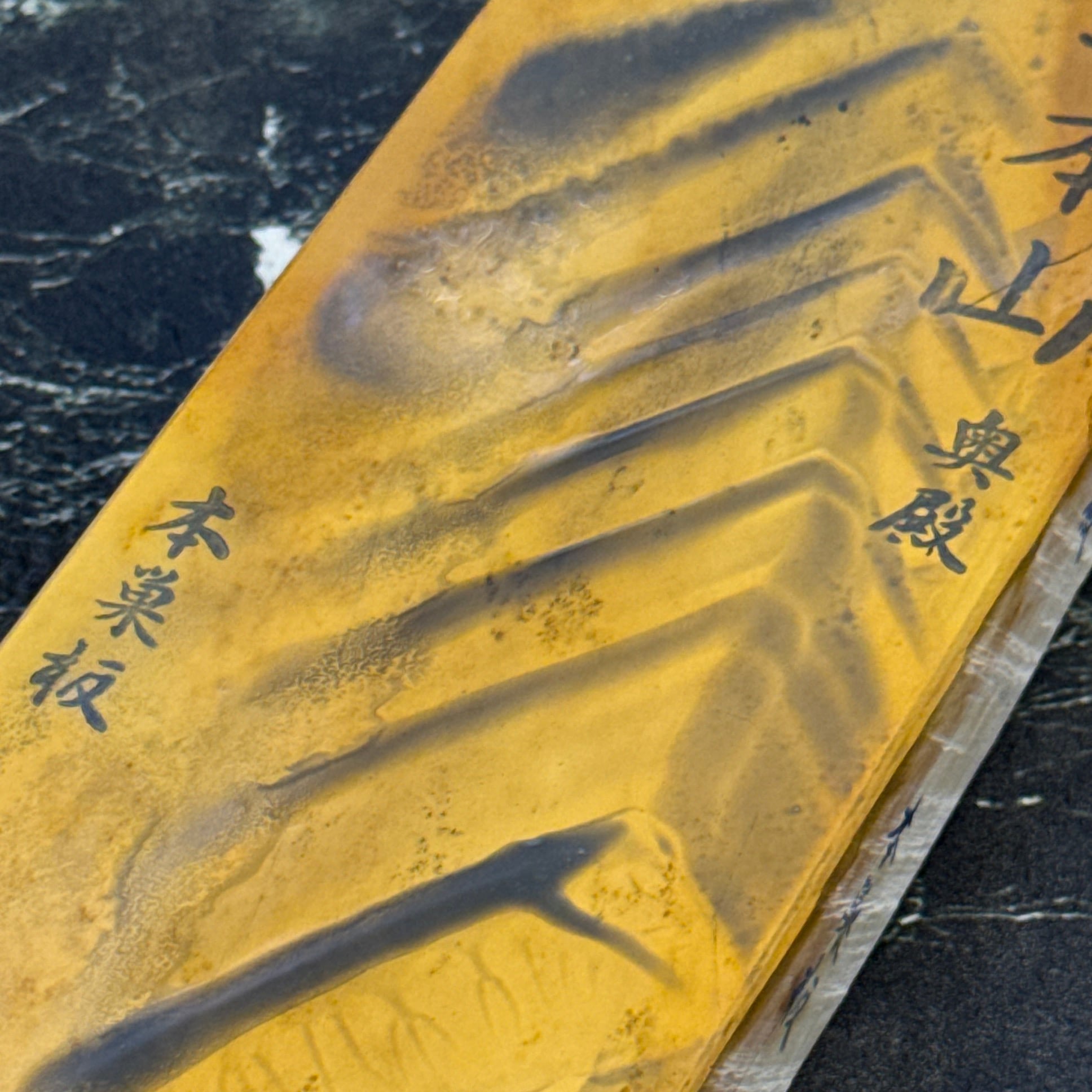 刃先の硬化作用があるとされ、地金とハガネ部の境を際立たせる仕上がりは人造砥石では再現できないといわれています。