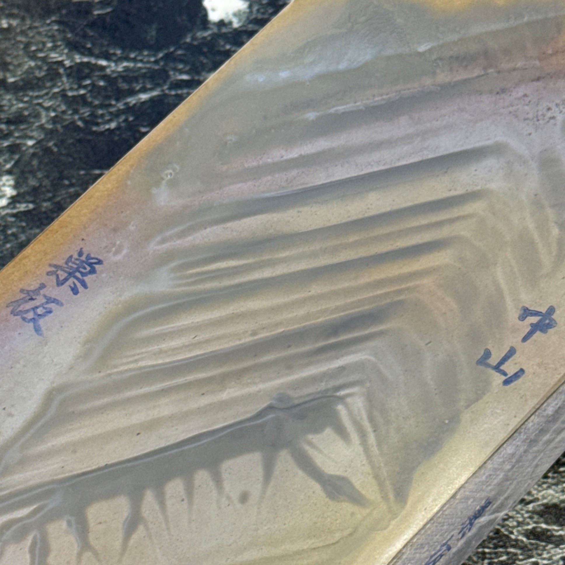 刃先の硬化作用があるとされ、地金とハガネ部の境を際立たせる仕上がりは人造砥石では再現できないといわれています。