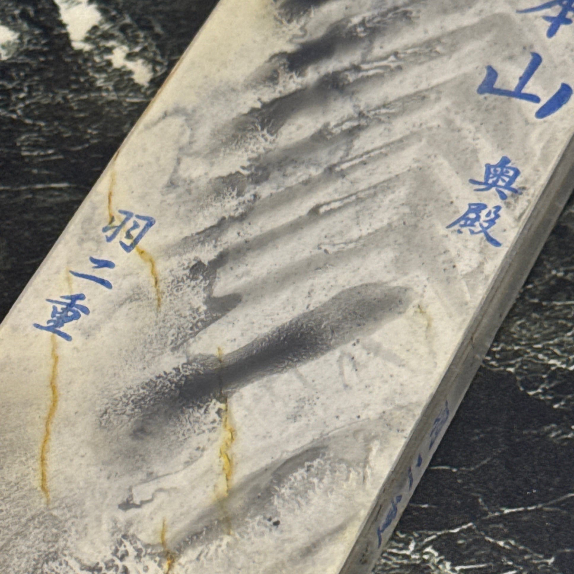 刃先の硬化作用があるとされ、地金とハガネ部の境を際立たせる仕上がりは人造砥石では再現できないといわれています。