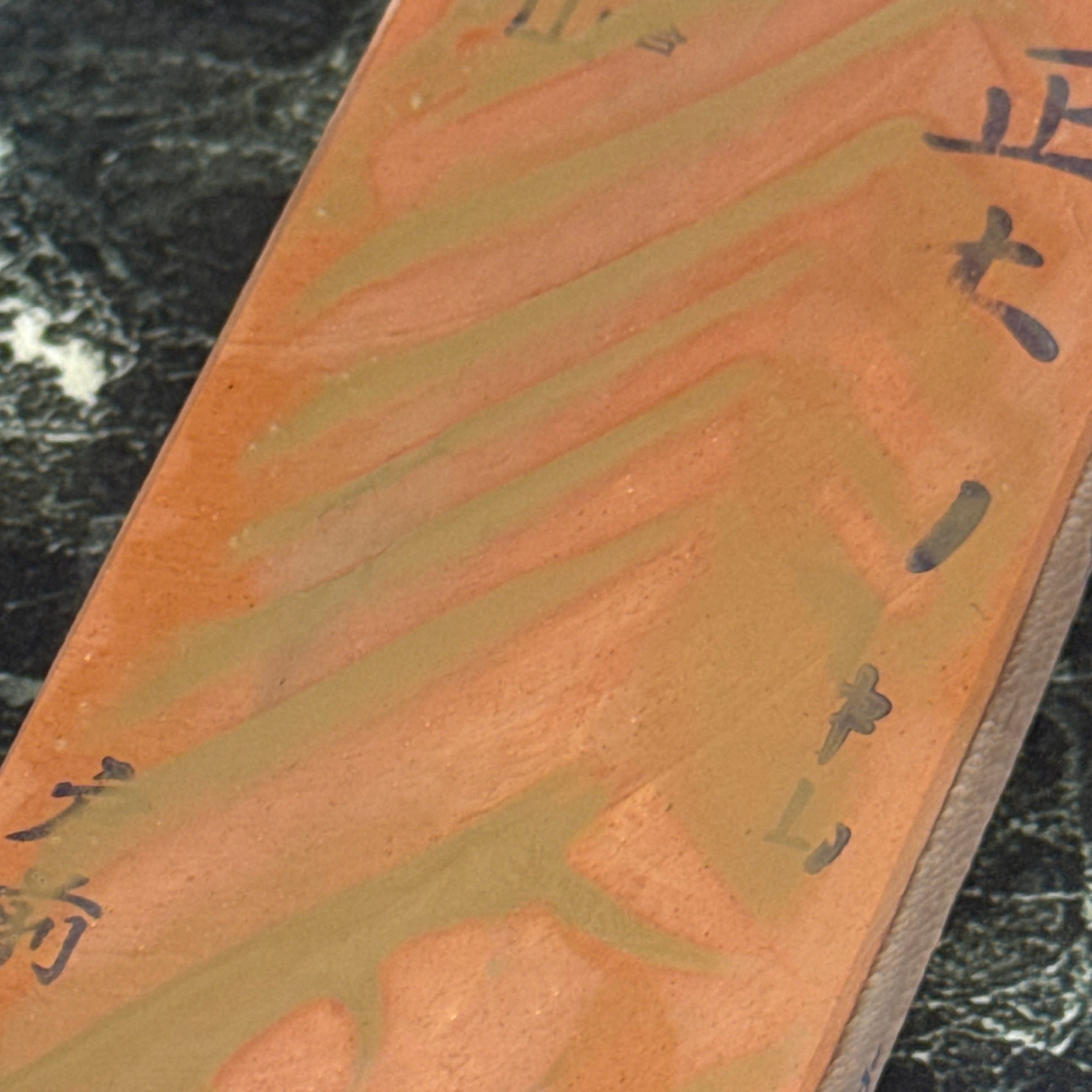 刃先の硬化作用があるとされ、地金とハガネ部の境を際立たせる仕上がりは人造砥石では再現できないといわれています。