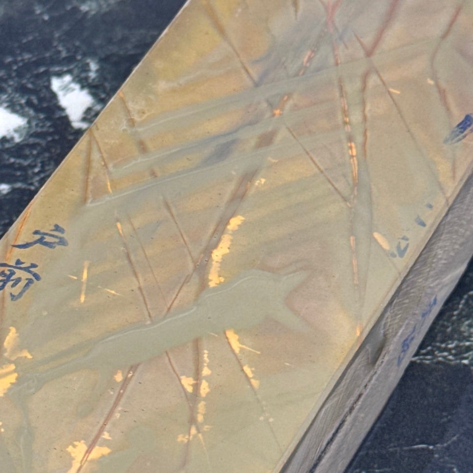 刃先の硬化作用があるとされ、地金とハガネ部の境を際立たせる仕上がりは人造砥石では再現できないといわれています。